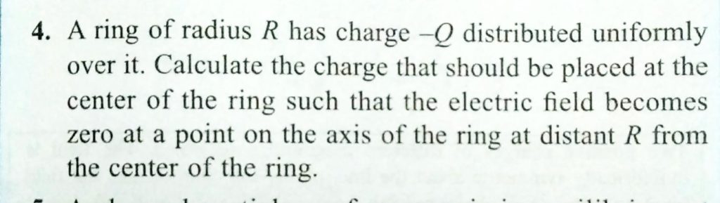 A ring of radius R has charge -Q distributed uniformly over it ,. calculate the chrage that should be placed at the centre of the ring such that the electric field becomes zero at a point on the axis of the ring at distant R from the centre of the ring.