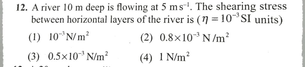 A river 10 m deep is flowing at 5 m/s . The shearing stress horizontal layers of the river is ( n = 10^-3 SI units ) A river 10 m deep is flowing at 5 m/s . The shearing stress horizontal layers of the river is ( n = 10^-3 SI units ) October 11, 2020 Category: Uncategorised (JEE Advanced Physics by BM Sharma + GMP Solutions) , Facebook Messenger WhatsApp Share this:TwitterFacebook Related