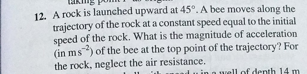 A rock is launched upward at 45. A bee moves along the trajectory of the rock at a constant speed equal to the initial speed of the rock. What is the magnitude of acceleration of the bee A rock is launched upward at 45. A bee moves along the trajectory of the rock at a constant speed equal to the initial speed of the rock. What is the magnitude of acceleration of the bee September 22, 2020 Category: Uncategorised (JEE Advanced Physics by BM Sharma + GMP Solutions) , Facebook Messenger WhatsApp Share this:TwitterFacebook Related