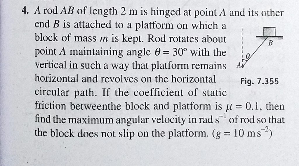 A rod AB of length 2 m is hinged at point A and its other end B is attached to a platform on which a block of mass m is kept. Rod rotates about point A maintaining angle theta = 30 A rod AB of length 2 m is hinged at point A and its other end B is attached to a platform on which a block of mass m is kept. Rod rotates about point A maintaining angle theta = 30 October 2, 2020 Category: Uncategorised (JEE Advanced Physics by BM Sharma + GMP Solutions) , Facebook Messenger WhatsApp Share this:TwitterFacebook Related