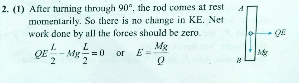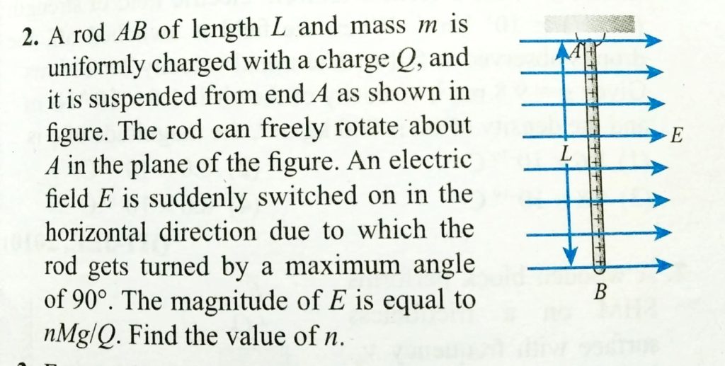 A rod AB of length L and mass m is uniformly charged with a charge Q, and it is suspended from end A as shown in fig. The rod can freely rotate about A in the plane of the figure. An electric field E is suddenly switched on in the horizontal direction due to which the rod gets turned by a maximum angle of 90∘. The magnitude of E is equal of n Mg/Q. Find the value of n.