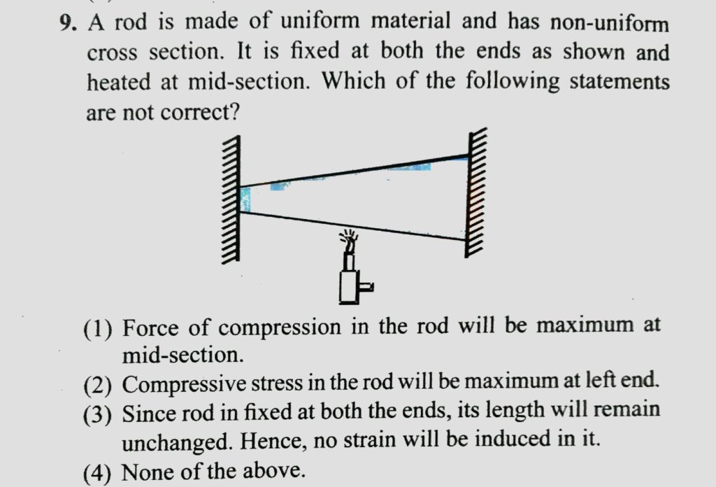 A rod is made of uniform material and has non-uniform cross section. It is fixed at both the ends as shown and heated at mid-section. Which of the following are not correct? A rod is made of uniform material and has non-uniform cross section. It is fixed at both the ends as shown and heated at mid-section. Which of the following are not correct? October 10, 2020 Category: Uncategorised (JEE Advanced Physics by BM Sharma + GMP Solutions) , Facebook Messenger WhatsApp Share this:TwitterFacebook Related