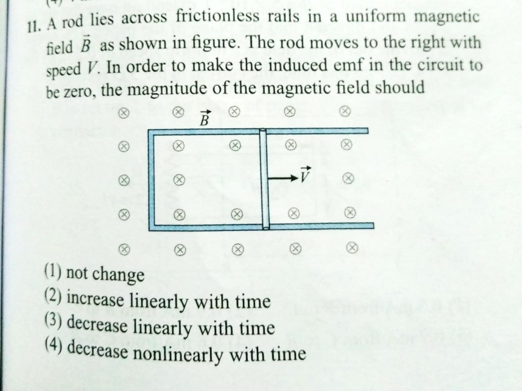 A rod lies across frictionless rails in a uniform magnetic field B as shown in figure. The rid moves to the right with speed V. In order to make the induced emf in the circuit to be zero, the magnitude of the magnetic field should A rod lies across frictionless rails in a uniform magnetic field B as shown in figure. The rid moves to the right with speed V. In order to make the induced emf in the circuit to be zero the magnitude of the magnetic field should October 19, 2020 Category: Uncategorised (JEE Advanced Physics by BM Sharma + GMP Solutions) , Facebook Messenger WhatsApp Share this:TwitterFacebook Related