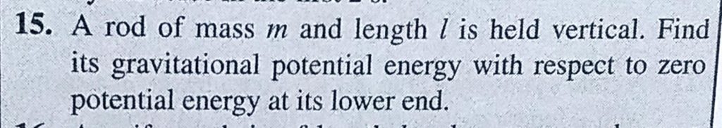 A rod of mass m and length l is held vertical. Find its gravitational potential energy with respect to zero potential energy at its lower end. A rod of mass m and length l is held vertical. Find its gravitational potential energy with respect to zero potential energy at its lower end. October 3, 2020 Category: Uncategorised (JEE Advanced Physics by BM Sharma + GMP Solutions) , Facebook Messenger WhatsApp Share this:TwitterFacebook Related