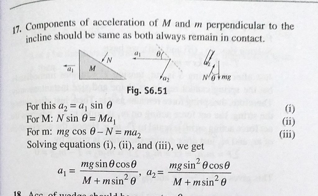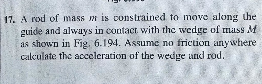 A rod of mass m is constrained to move along the guide and always in contact with wedge of mass M as shown in Fig. 6.194. Assume no friction anywhere calculate the acceleration of the wedge and rod. A rod of mass m is constrained to move along the guide and always in contact with wedge of mass M as shown in Fig. 6.194. Assume no friction anywhere calculate the acceleration of the wedge and rod. September 28, 2020 Category: Uncategorised (JEE Advanced Physics by BM Sharma + GMP Solutions) , Facebook Messenger WhatsApp Share this:TwitterFacebook Related