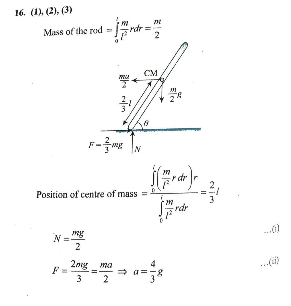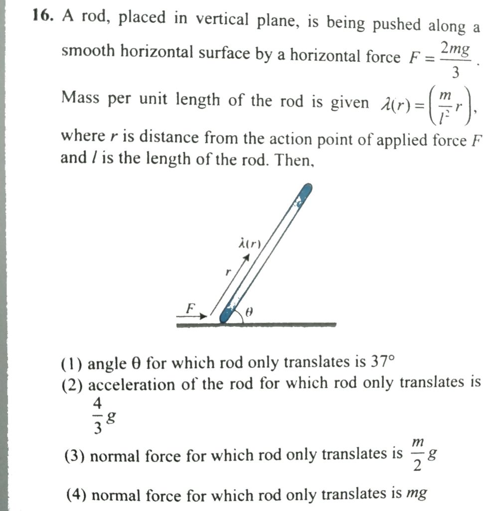 A rod placed in vertical plane is being pushed along a smooth horizontal surface by a horizontal force F = 2mg /3. Mass per unit length of the rod is given lamda (r) = [ m / l^2 r ]. where r is distance from the action point of applied force F and l is the length of the rod. Then ,
