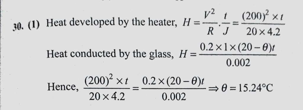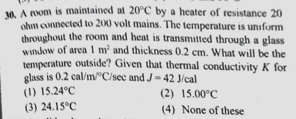 A room is maintained at 20 C by a heater of resistance 20 ohm connected to 200 volt mains. The temperature is uniform throughout the room and heat is transmitted through a glass A room is maintained at 20 C by a heater of resistance 20 ohm connected to 200 volt mains. The temperature is uniform throughout the room and heat is transmitted through a glass October 25, 2020 Category: Uncategorised (JEE Advanced Physics by BM Sharma + GMP Solutions) , Facebook Messenger WhatsApp Share this:TwitterFacebook Related
