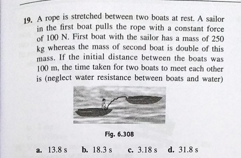 A rope is stretched between two boats at rest. A sailor in the first boat pulls the rope with a constant force of 100 N. First boat with the sailor has a mass of 250 kg whereas the mass of A rope is stretched between two boats at rest. A sailor in the first boat pulls the rope with a constant force of 100 N. First boat with the sailor has a mass of 250 kg whereas the mass of September 29, 2020 Category: Uncategorised (JEE Advanced Physics by BM Sharma + GMP Solutions) , Facebook Messenger WhatsApp Share this:TwitterFacebook Related