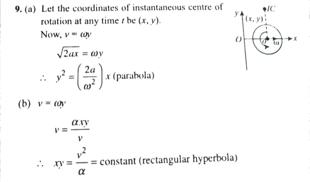 A rotating disc moves in the positive direction of x-axis as shown. Find the equation y(x) describing the position of the instantaneous axis of rotation if at the initial moment the centre C of the disc was located at origin after which a. it moved with constant acceleration ‘a’ (initial velocity zero) while the disc rotating anticlockwise with constant angular velocity ω. b. it moved with constant velocity v while the disc started rotating anticlockwise with a constant angular acceleration α (with initial angular velocity zero).