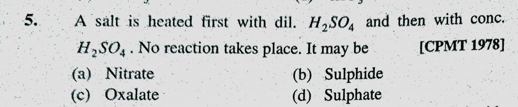 A salt is heated first with dil. H2SO4 and then with conc. H2SO4. No reaction takes place. It may be (a) Nitrate (b) Sulphide (c) Oxalate A salt is heated first with dil. H2SO4 and then with conc. H2SO4. No reaction takes place. It may be (a) Nitrate (b) Sulphide (c) Oxalate December 6, 2020 Category: Uncategorised (JEE Advanced Physics by BM Sharma + GMP Solutions) , Facebook Messenger WhatsApp Share this:TwitterFacebook Related