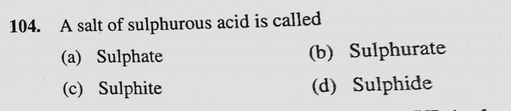 A salt of sulphurous acid is called (a) Sulphate (b) Sulphurate (c) Sulphite (d) Sulphide A salt of sulphurous acid is called (a) Sulphate (b) Sulphurate (c) Sulphite (d) Sulphide November 24, 2020 Category: Uncategorised (JEE Advanced Physics by BM Sharma + GMP Solutions) , Facebook Messenger WhatsApp Share this:TwitterFacebook Related