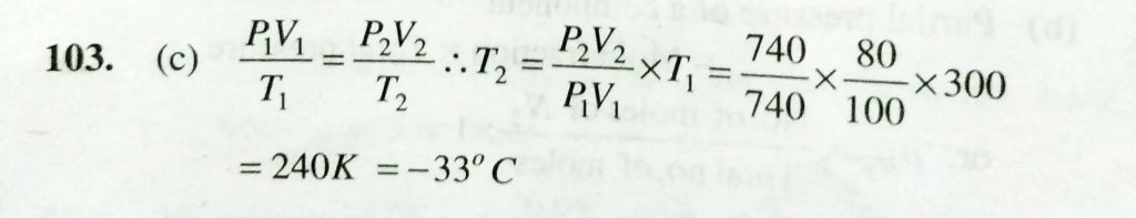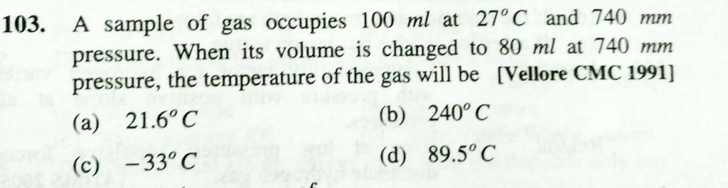 A sample of gas occupies 100 ml at 27 degree C and 740 mm pressure. when its volume is changed to 80 ml at 740 mm pressure , the temperature of the gas will be A sample of gas occupies 100 ml at 27 degree C and 740 mm pressure. when its volume is changed to 80 ml at 740 mm pressure the temperature of the gas will be February 11, 2021 Category: Uncategorised (JEE Advanced Physics by BM Sharma + GMP Solutions) , Facebook Messenger WhatsApp Share this:TwitterFacebook Related