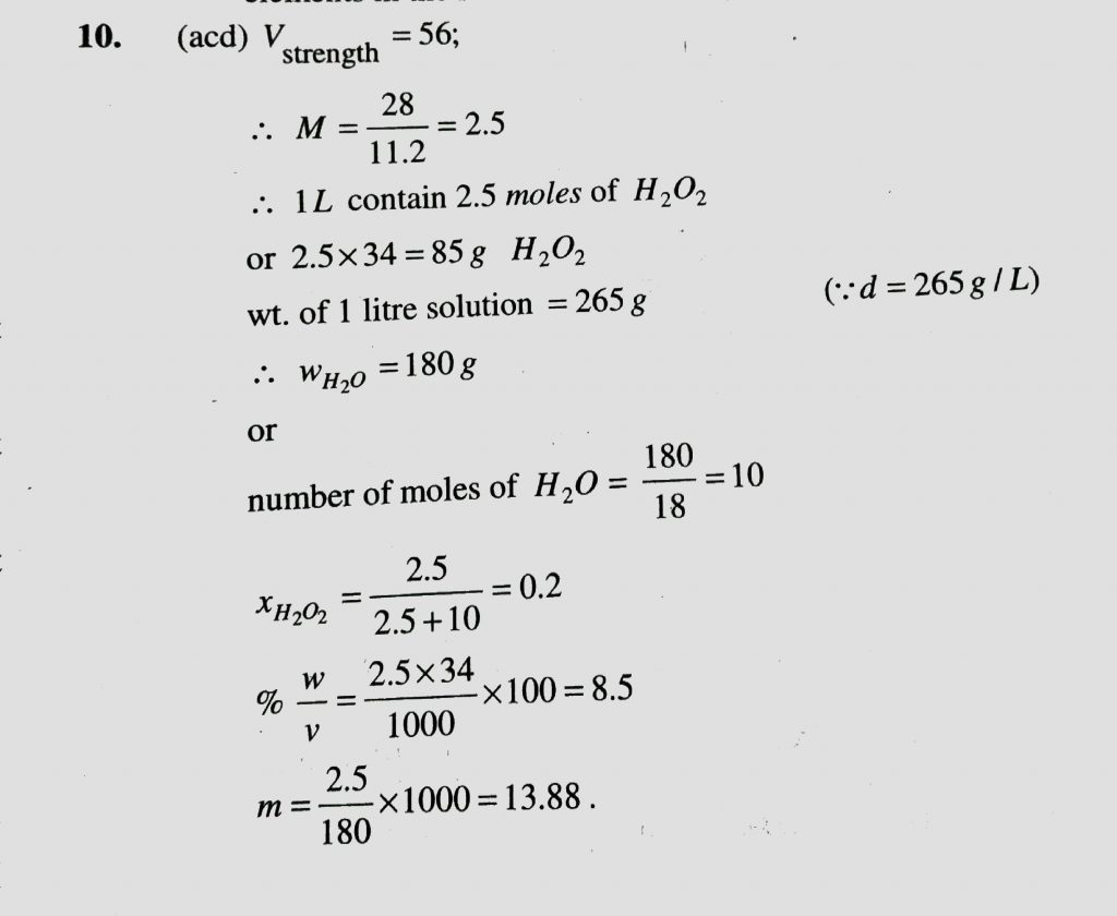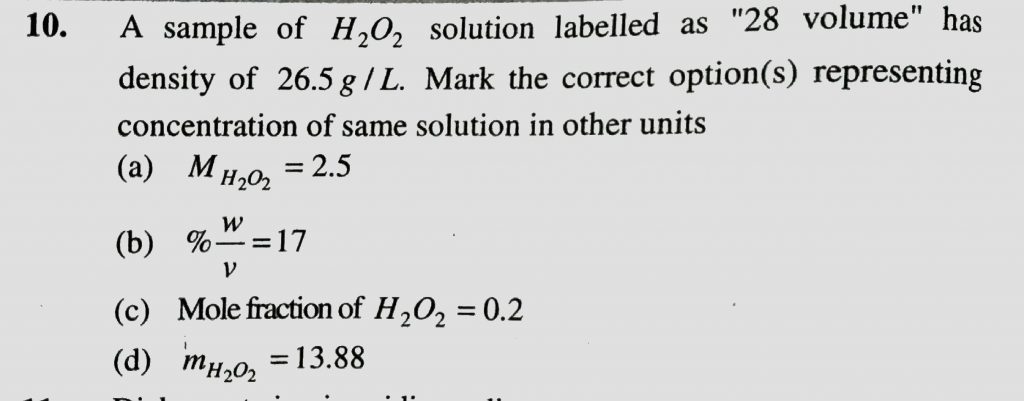 A sample of H2O2 solution labbled as “28 volume ” has density of 26.5 g/L. Mark the correct options representing concentration of same solution in other units A sample of H2O2 solution labbled as "28 volume " has density of 26.5 g/L. Mark the correct options representing concentration of same solution in other units November 25, 2020 Category: Uncategorised (JEE Advanced Physics by BM Sharma + GMP Solutions) , Facebook Messenger WhatsApp Share this:TwitterFacebook Related