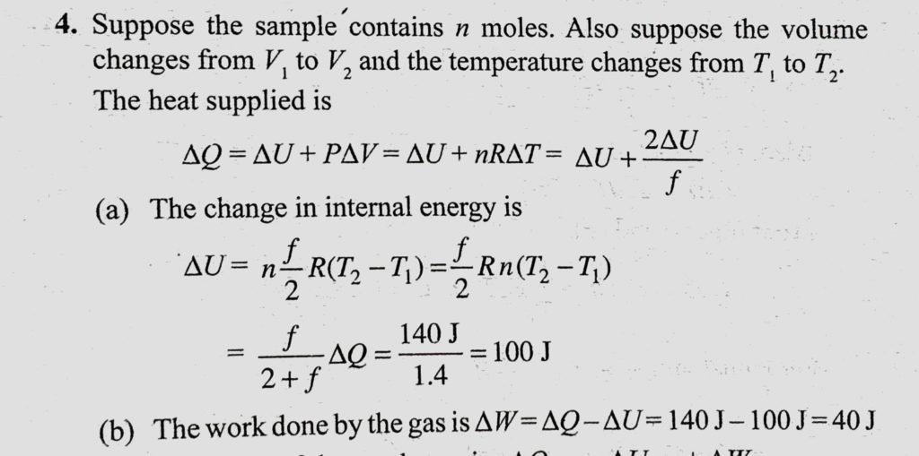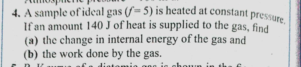 A sample of ideal gas (f = 5) is heated at constant pressure. If an amount 140 J of heat is supplied to the gas, find (a) the change in internal energy of the gas and (b) the work done A sample of ideal gas (f = 5) is heated at constant pressure. If an amount 140 J of heat is supplied to the gas find (a) the change in internal energy of the gas and (b) the work done October 28, 2020 Category: Uncategorised (JEE Advanced Physics by BM Sharma + GMP Solutions) , Facebook Messenger WhatsApp Share this:TwitterFacebook Related