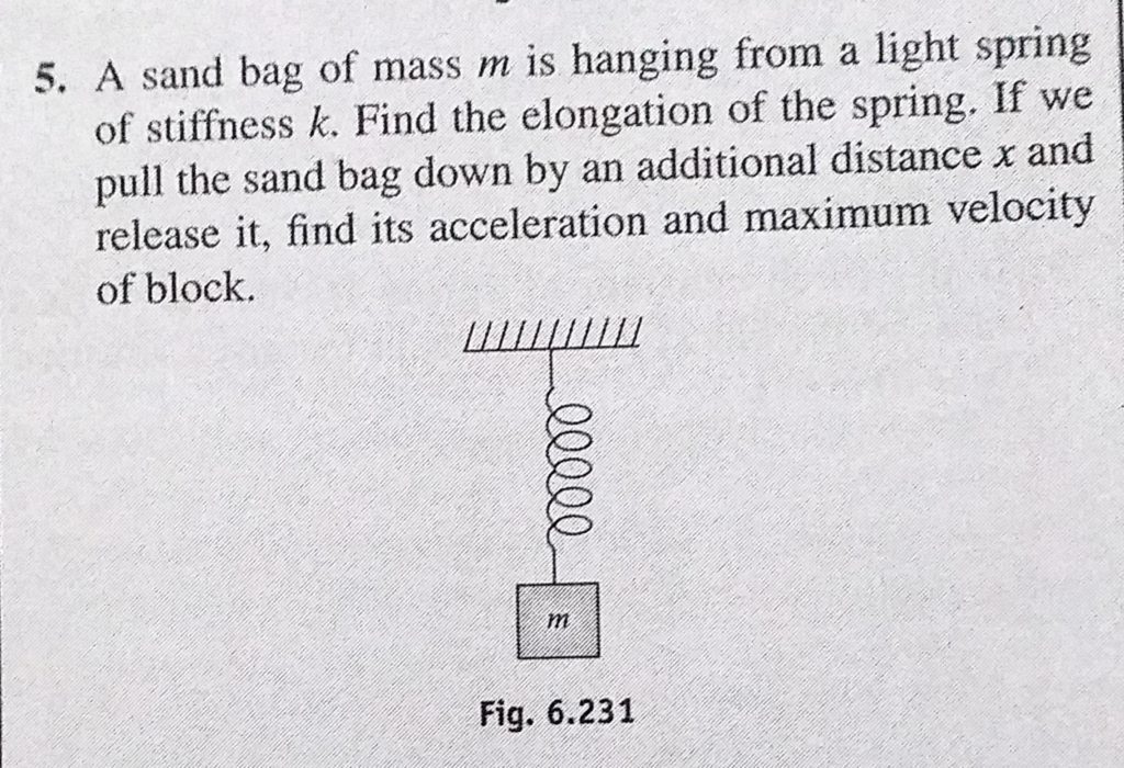 A sand bag of mass m is hanging from a light spring of stiffness k. Find the elongation of the spring. If we pull the sand bad down by an additional distance x and release it, find its acceleration A sand bag of mass m is hanging from a light spring of stiffness k. Find the elongation of the spring. If we pull the sand bad down by an additional distance x and release it find its acceleration September 29, 2020 Category: Uncategorised (JEE Advanced Physics by BM Sharma + GMP Solutions) , Facebook Messenger WhatsApp Share this:TwitterFacebook Related