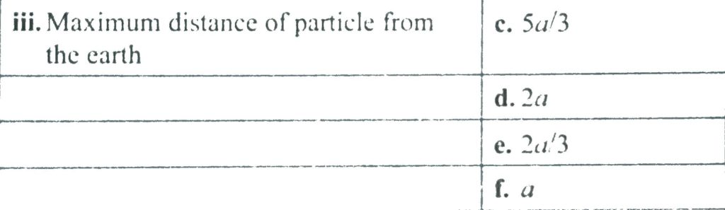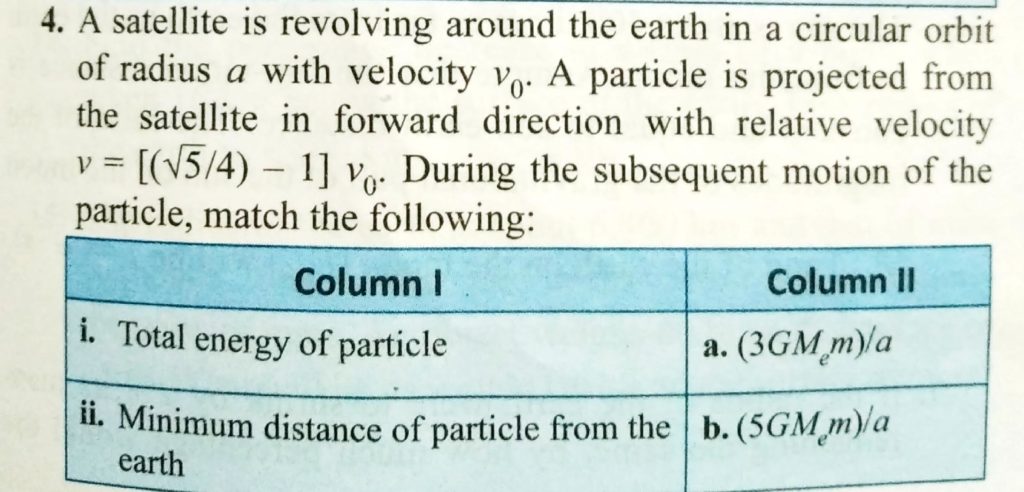 A satellite is revolving round the earth (mass Me) in a circular orbit of radius a with velocity V0 A particle of mass m is projected from the satellite in forward direction with relative velocity v [ root 5/4 – 1 ]V0. During subsequent motion of particle. Match the following.