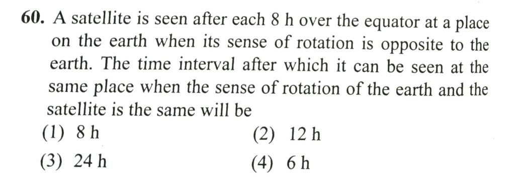 A satellite is seen after every 8 hours over the equator at a place on the earth when its sense of rotation is opposite to the earth. The time interval after which it can be seen at the same place when the sense of rotation of earth and satellite is same will be: