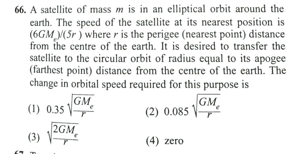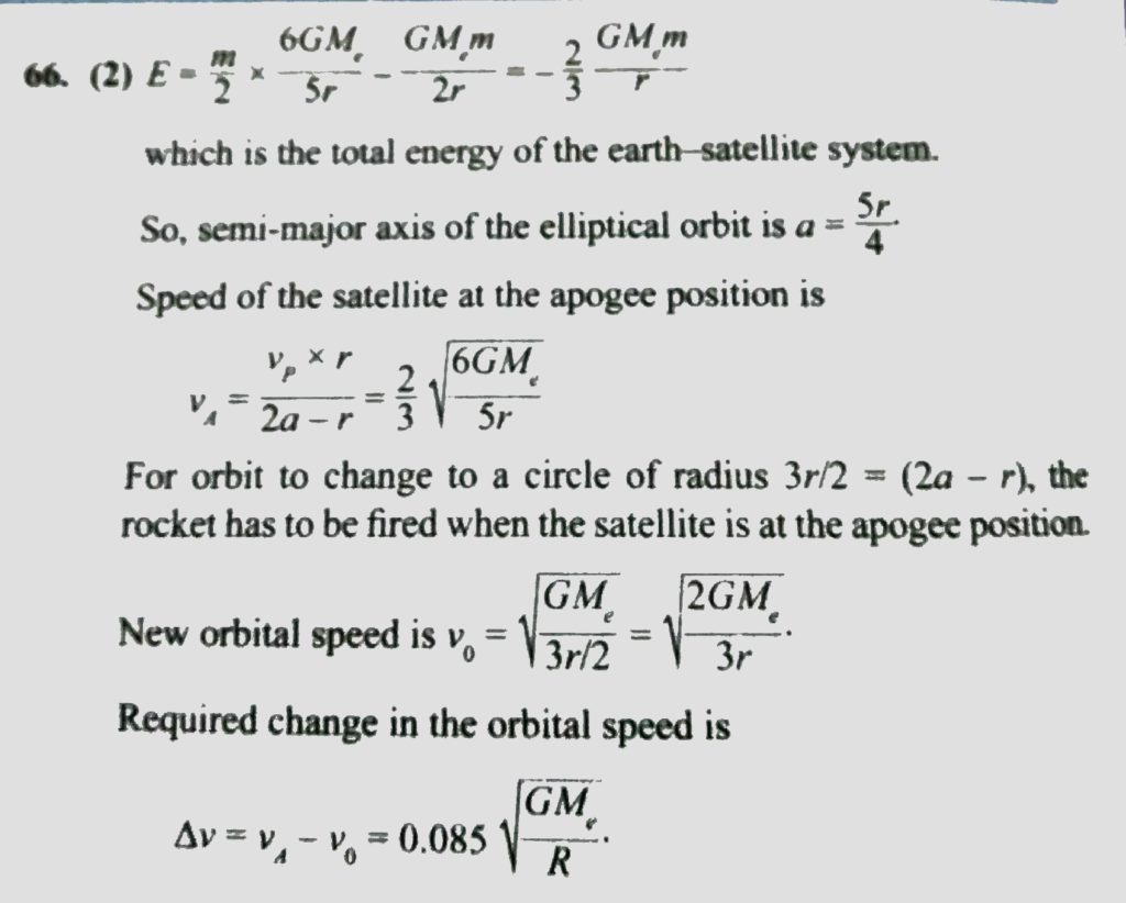 A satellite of mass m is in an elliptical orbit around the earth. The speed of the satellite at its nearest position is (6GM)/(5r) where r is the perigee (nearest point) distance from the centre of the earth. It is desired to transfer the satellite to the circular orbit of radius equal to its apogee (farthest point) distance from the centre of the earth. The change in orbital speed required for this purpose is