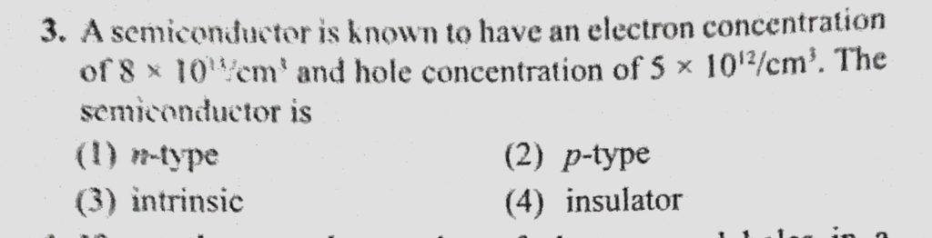 A semiconductor is known to have an electron concentration of 8 * 10^12/cm^3 and hole concentration of 5 * 10^12/cm^3. The semiconductor is A semiconductor is known to have an electron concentration of 8 * 10^12/cm^3 and hole concentration of 5 * 10^12/cm^3. The semiconductor is October 21, 2020 Category: Uncategorised (JEE Advanced Physics by BM Sharma + GMP Solutions) , Facebook Messenger WhatsApp Share this:TwitterFacebook Related