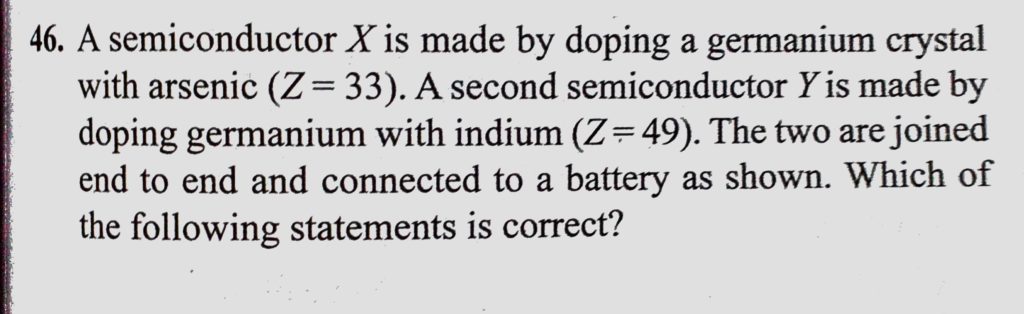 A semiconductor X is made by doping a germanium crystal with arsenic (Z = 33). A second semiconductor Y is made by doping germanium with indium ( Z = 49). The two are joined end to end A semiconductor X is made by doping a germanium crystal with arsenic (Z = 33). A second semiconductor Y is made by doping germanium with indium ( Z = 49). The two are joined end to end October 22, 2020 Category: Uncategorised (JEE Advanced Physics by BM Sharma + GMP Solutions) , Facebook Messenger WhatsApp Share this:TwitterFacebook Related