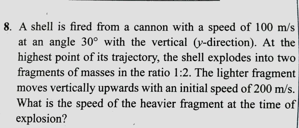 A shell is fired from a cannon with a speed of 100 m/s at an angle 30∘ with the vertical (y-direction). At the highest point of its trajectory, the shell explodes into two fragments of masses in the ratio 1:2. The lighter fragment moves vertically upwards with an initial speed of 200 m/s. What is the speed of the heavier fragment at the time of explosion?