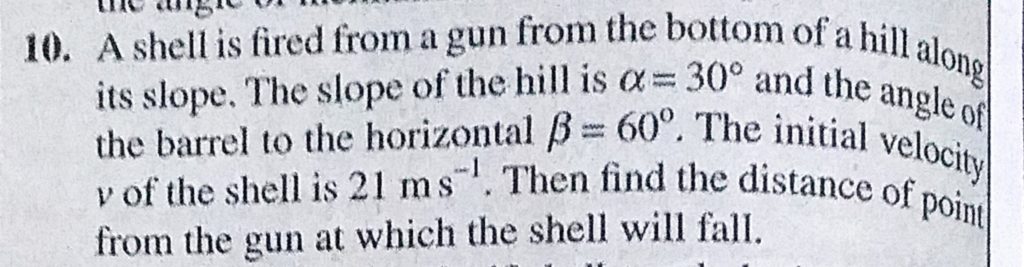 A shell is fired from a gun from the bottom of a hill along its slope. The slope of the hill is alpha = 30 and the angle of the barrel to the horizontal beta = 60. The initial velocity v of the shell is 21 m/s A staircase contains three steps each 10 cm high and 20 cm wide. What should be the minimum horizontal velocity of a ball rolling off the uppermost plane so as to hit directly the lowest plane? September 21, 2020 Category: Uncategorised (JEE Advanced Physics by BM Sharma + GMP Solutions) , Facebook Messenger WhatsApp Share this:TwitterFacebook Related