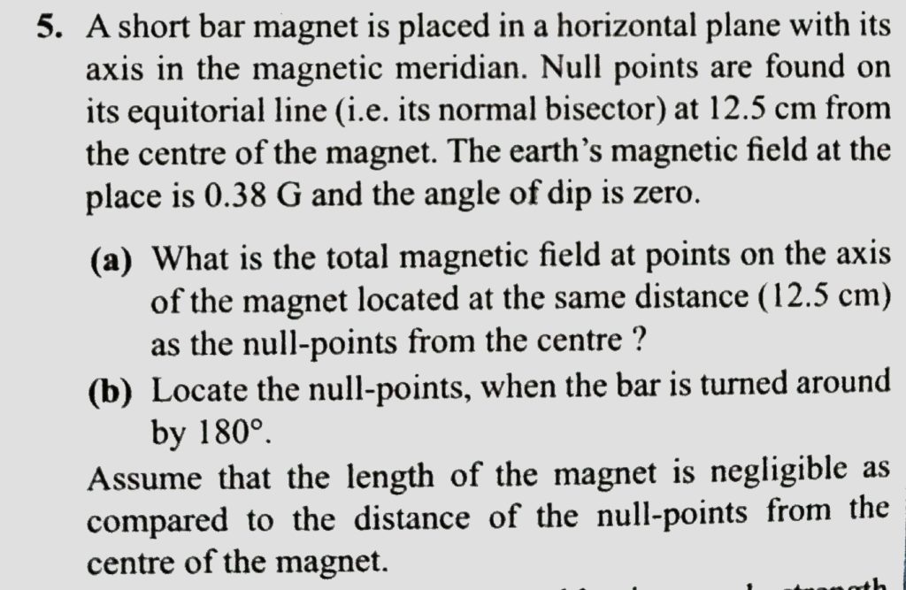 A short bar magnet is placed in a horizontal plane with its axis in the magnetic merdian . Null points are found on its equitorial line (i.e., its normal bisector) at 12.5 G and the angle of dip is zero. (i) What is the total magnetic field at points on the axis of the magnet located by the same distance (12.5 cm) as the null-points from the centre? (ii) Locate the null points when the magnet is turned around by 180∘ . Assume that the length of the magnet is negligible as compared to the distance of the null-point from the centre of the magnet.