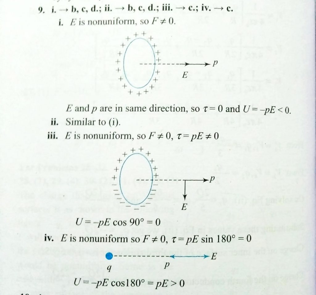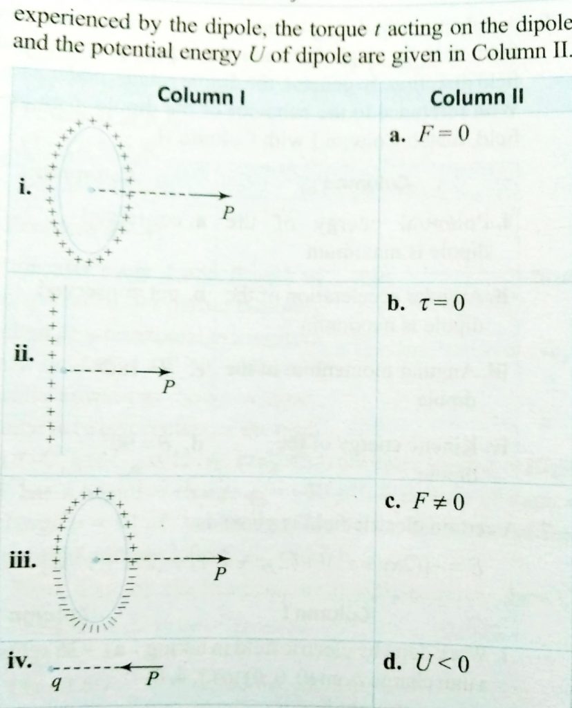A short dipole of dipole moment P is kept near diffeent sources of electric field ( an infinite line charge , a point charge , a ring charge , etc ) in column I . the force F experienced by the dipole and the potential energy U of dipole are given in column II.