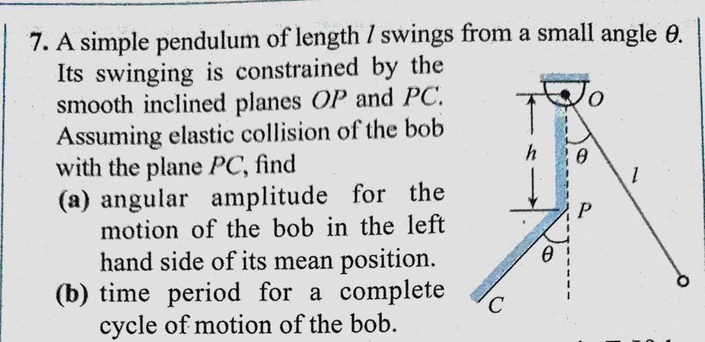 A simple pendulum of length l swings from a small angle theta. Its swinging is constrained by the smooth inclined planes OP and PC. Assuming elastic collision of the bob with A simple pendulum of length l swings from a small angle theta. Its swinging is constrained by the smooth inclined planes OP and PC. Assuming elastic collision of the bob with October 30, 2020 Category: Uncategorised (JEE Advanced Physics by BM Sharma + GMP Solutions) , Facebook Messenger WhatsApp Share this:TwitterFacebook Related