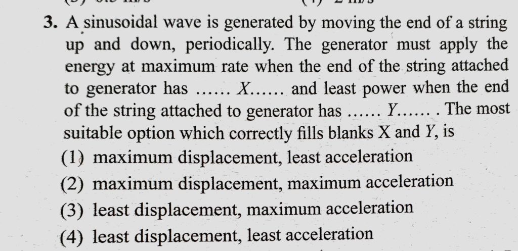 A sinusoidal wave is generated by moving the end of a string up and down, periodically. The generator must apply the energy at maximum rate when the end of the string attached A sinusoidal wave is generated by moving the end of a string up and down periodically. The generator must apply the energy at maximum rate when the end of the string attached November 1, 2020 Category: Uncategorised (JEE Advanced Physics by BM Sharma + GMP Solutions) , Facebook Messenger WhatsApp Share this:TwitterFacebook Related