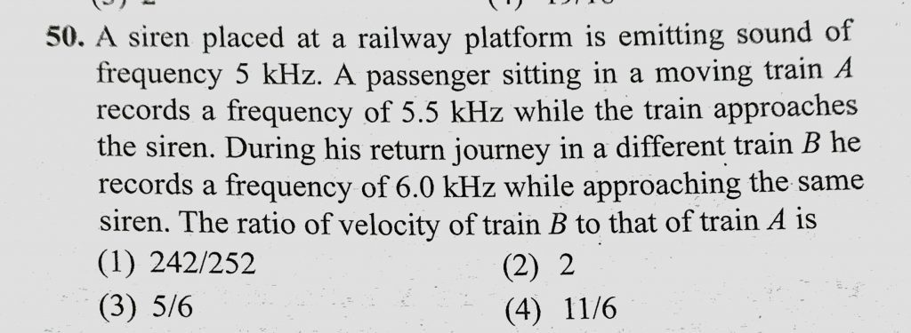 A siren placed at a railway platform is emitting sound of frequency 5 kHz. A passenger sitting in a moving train A records a frequency of 5.5 kHz while the train approaches A siren placed at a railway platform is emitting sound of frequency 5 kHz. A passenger sitting in a moving train A records a frequency of 5.5 kHz while the train approaches November 7, 2020 Category: Uncategorised (JEE Advanced Physics by BM Sharma + GMP Solutions) , Facebook Messenger WhatsApp Share this:TwitterFacebook Related