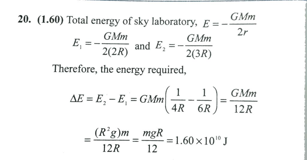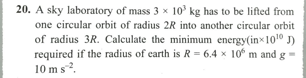 A sky laboratory of mass 3 × 10^3 kg has to be lifted from one circular orbit of radius 2 R into another circular orbit of radius 3R. Calculate the minimum energy required if the radius of earth is R = 6.4 × 10^6 m and g = 10 m/s^2. Find the percentage decrease in weight of a body when taken 16 km below the surface of the earth. Take radius of the earth as 6400 Km. October 6, 2020 Category: Uncategorised (JEE Advanced Physics by BM Sharma + GMP Solutions) , Facebook Messenger WhatsApp Share this:TwitterFacebook Related