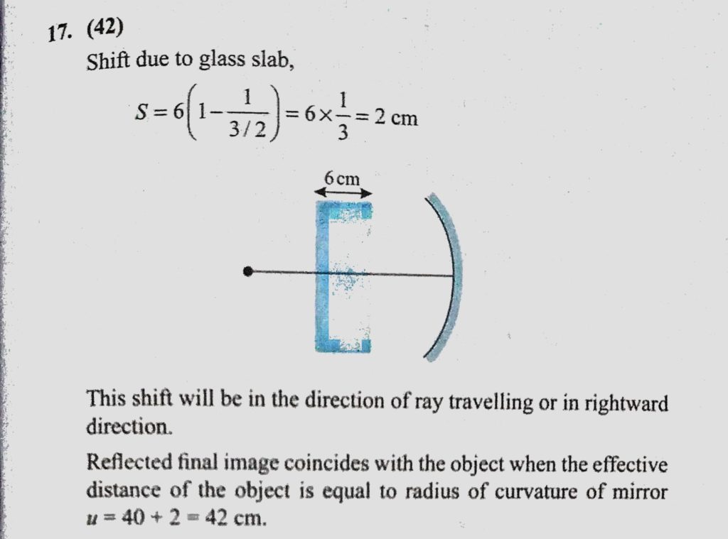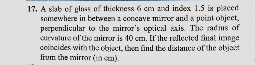 A slab of glass of thickness 6 cm and index 1.5 is placed somewhere in between a concave mirror and a point object, perpendicular to the mirror’s optical axis. The radius of curvature A slab of glass of thickness 6 cm and index 1.5 is placed somewhere in between a concave mirror and a point object perpendicular to the mirror's optical axis. The radius of curvature October 7, 2020 Category: Uncategorised (JEE Advanced Physics by BM Sharma + GMP Solutions) , Facebook Messenger WhatsApp Share this:TwitterFacebook Related