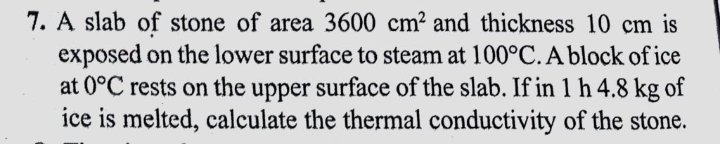 A slab of stone of area 3600 cm^2 and thickness 10 cm is exposed on the lower surface to steam at 100 C. A block of ice at 0 C rests on the upper surface of the slab. If in 1 h A slab of stone of area 3600 cm^2 and thickness 10 cm is exposed on the lower surface to steam at 100 C. A block of ice at 0 C rests on the upper surface of the slab. If in 1 h October 25, 2020 Category: Uncategorised (JEE Advanced Physics by BM Sharma + GMP Solutions) , Facebook Messenger WhatsApp Share this:TwitterFacebook Related