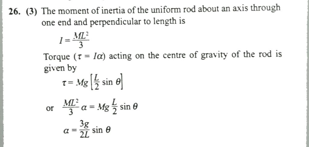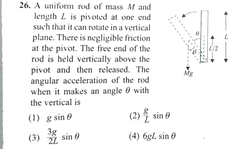 A slender uniform rod of mass M and length l is pivoted at one end so that it can rotate in a vertical plane (see figure). There is negligible friction at the pivot. The free end is held vertically above the pivot and then released. The angular acceleration of the rod when it makes an angle θ with vertical is