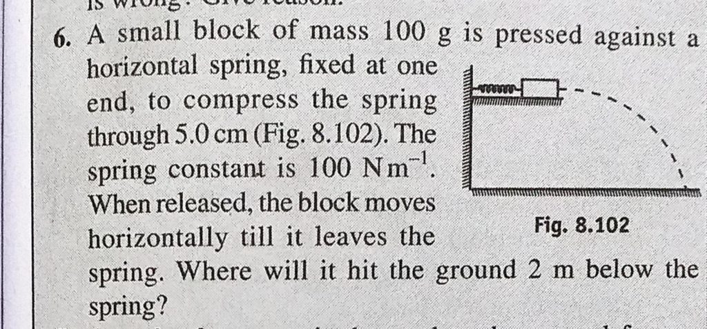 A small block of mass 100 g is pressed against a horizontal spring, fixed at one end, to compress the spring through 5.0 cm (Fig. 8.102). The spring constant is 100 N/m. When released, the block moves A small block of mass 100 g is pressed against a horizontal spring fixed at one end the block moves to compress the spring through 5.0 cm (Fig. 8.102). The spring constant is 100 N/m. When released October 2, 2020 Category: Uncategorised (JEE Advanced Physics by BM Sharma + GMP Solutions) , Facebook Messenger WhatsApp Share this:TwitterFacebook Related