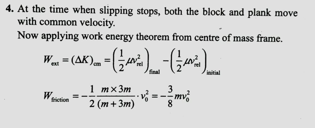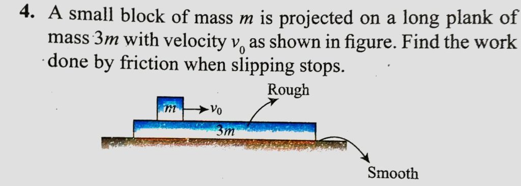 A small block of mass m is projected on a long plank of mass 3 m with velocity v0 as shown in figure. Find the work done by friction when slipping stops. A small block of mass m is projected on a long plank of mass 3 m with velocity v0 as shown in figure. Find the work done by friction when slipping stops. September 20, 2020 Category: Uncategorised (JEE Advanced Physics by BM Sharma + GMP Solutions) , Facebook Messenger WhatsApp Share this:TwitterFacebook Related