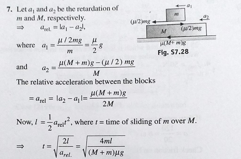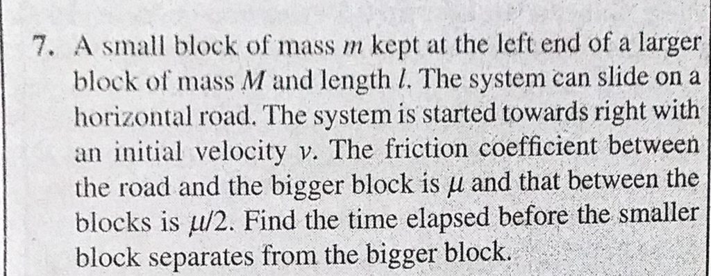 A small block of mass m kept at the left end of a larger block of mass M and length l. The system can slide on a horizontal road. The system is started towards right with an initial velocity v. A small block of mass m kept at the left end of a larger block of mass M and length l. The system can slide on a horizontal road. The system is started towards right with an initial velocity v. September 30, 2020 Category: Uncategorised (JEE Advanced Physics by BM Sharma + GMP Solutions) , Facebook Messenger WhatsApp Share this:TwitterFacebook Related