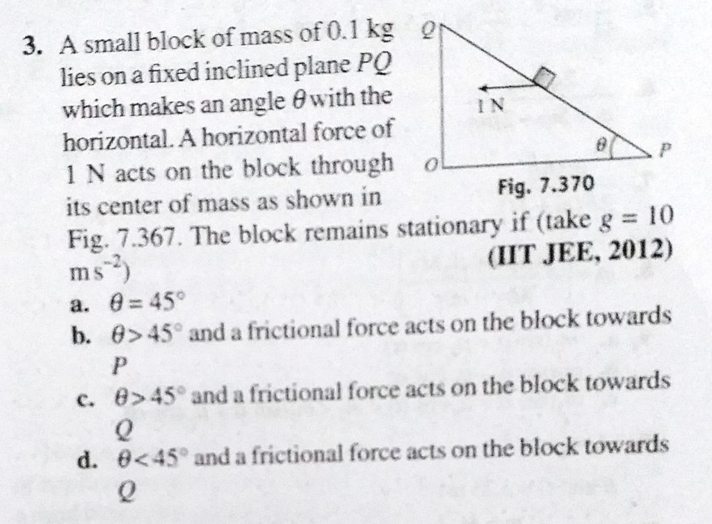 A small block of mass of 0.1 kg lies on a fixed inclined plane PQ which makes an angle theta with the horizontal. A horizontal force of 1 N acts on the block through its center of mass as shown A small block of mass of 0.1 kg lies on a fixed inclined plane PQ which makes an angle theta with the horizontal. A horizontal force of 1 N acts on the block through its center of mass as shown October 2, 2020 Category: Uncategorised (JEE Advanced Physics by BM Sharma + GMP Solutions) , Facebook Messenger WhatsApp Share this:TwitterFacebook Related
