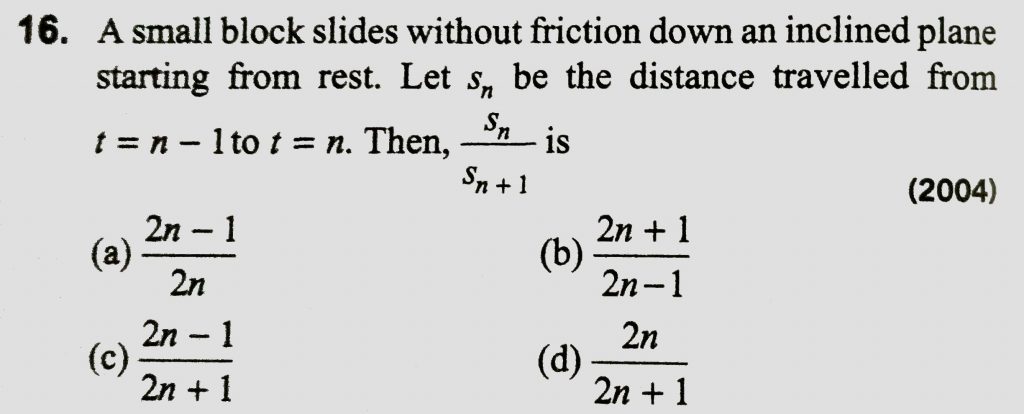 A small block sides without friction down an inclined plane starting from rest. Let Sn be the distance traveled from t=n-1 to t = n. Then, Sn/Sn+1 is A small block sides without friction down an inclined plane starting from rest. Let Sn be the distance traveled from t=n-1 to t = n. Then Sn/Sn+1 is February 13, 2021 Category: Uncategorised (JEE Advanced Physics by BM Sharma + GMP Solutions) , Facebook Messenger WhatsApp Share this:TwitterFacebook Related