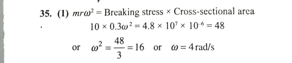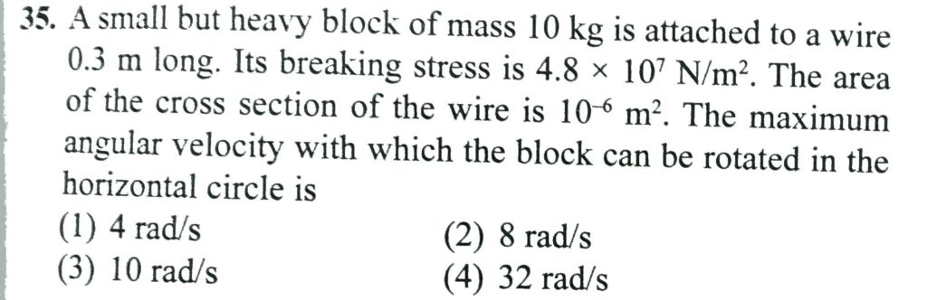 A small but heavy block of mass 10 kg is attached to a wire 0. 3 m long. Its breaking stress is 4.8 × 10^7 N/m^2. The area of the cross section of the wire is 10^−6 m^2. The maximum angular velocity with which the block can be rotated in the horizontal circle is