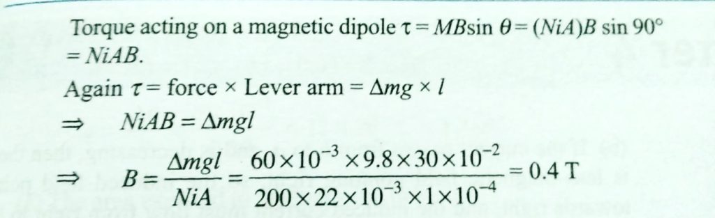 A small coil C with N = 200 turns is mounted on one end of a balance beam and introduced between the poles of an electromagnet as shown in figure. The cross sectional area of coil is A = 1.0 cm^2, length of arm OA of the balance beam is l = 30 cm. When there is no current in the coil the balance is in equilibrium. On passing a current I = 22 mA through the coil the equilibrium is restored by putting the additional counter weight of mass Δm = 60 mg on the balance pan. Find the magnetic induction at the spot where coil is located.