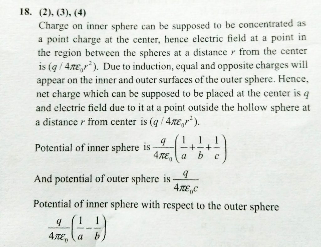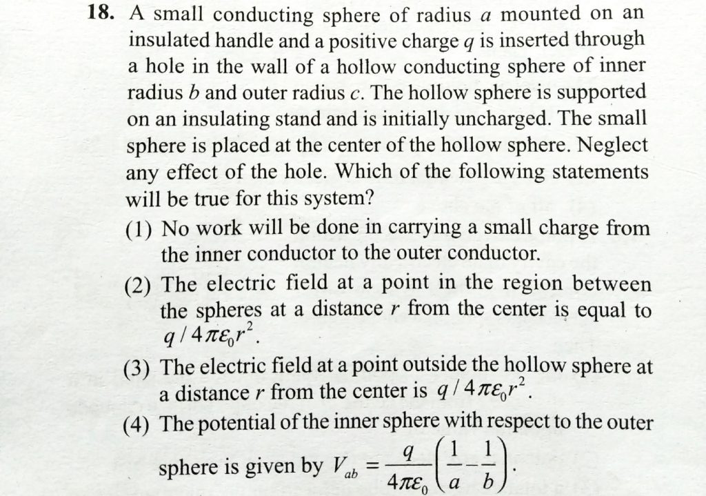 A small conducting sphere of radius a mounted on an insulated handle and a positive charge q is inserted through a hole in the wall of a hollow conducting sphere of inner radius b and outer radius c. The hollow sphere is supported on an insulating stand and is initially uncharged. The small sphere is placed at the center of the hollow sphere. Neglect any effect of the hole. Which of the following statements will be true for this system?