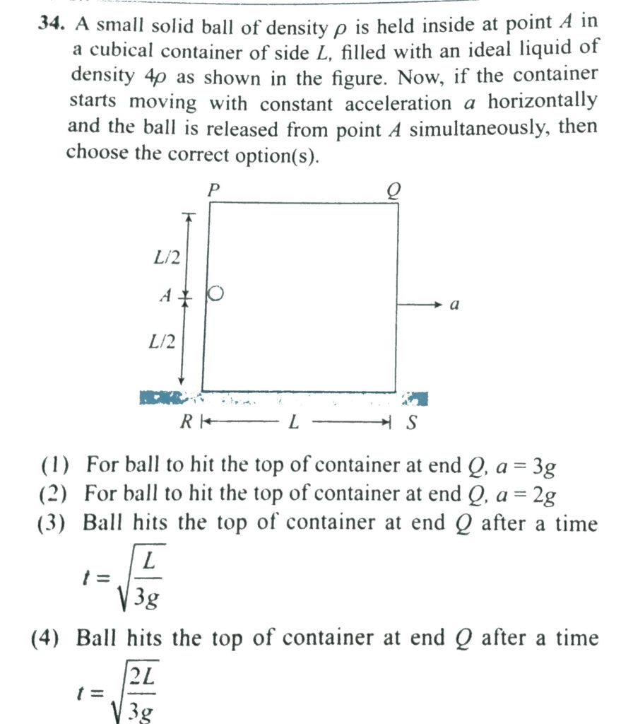 A small solid ball of density ρ is held inside at point A of a cubical container of side L, filled with an ideal liquid of density 4ρ as shown in the figure. Now, if the container starts moving with constant acceleration a horizontally and the ball is released from point A simultaneously, then choose from following the correct option(s)