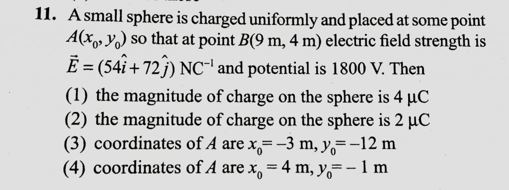 A small sphere is charged uniformly and placed at some point A ( x0 , y0 ) so that at point B ( 9m , 4 m ) electric field styrength is E = (54 i +72 j ) N/C and potential is 1800 V . then 4 m ) electric field styrength is E = (54 i +72 j ) N/C and potential is 1800 V . then A small sphere is charged uniformly and placed at some point A ( x0 y0 ) so that at point B ( 9m November 6, 2020 Category: Uncategorised (JEE Advanced Physics by BM Sharma + GMP Solutions) , Facebook Messenger WhatsApp Share this:TwitterFacebook Related