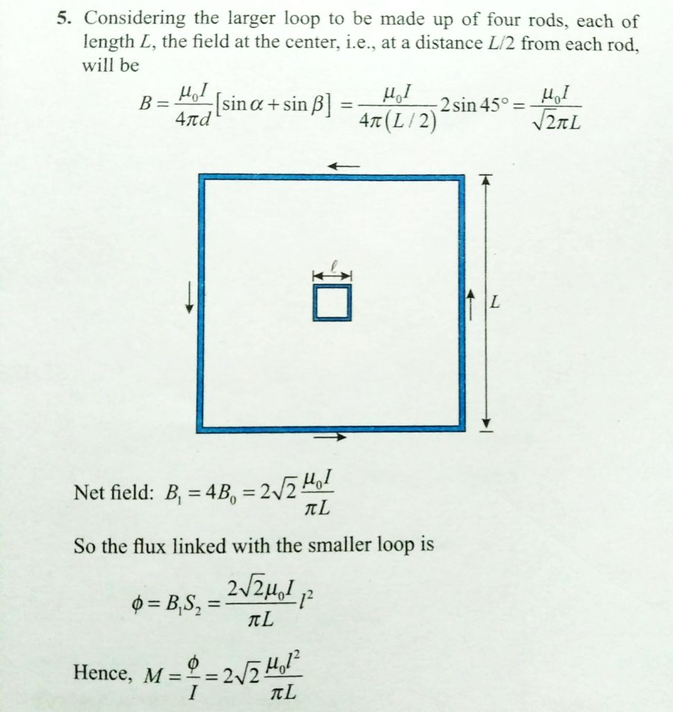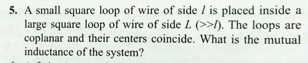 A small square loop of wire of side l is placed inside a large square loop of wire of side L(L>>l). The loops are co-planer and their centres coincide. What is the mutual inductance of the system ? A coil has indutance of 4 mH. If the current through the coil changes from 0.25 amp to 2 amp during 0.5 s find the average voltage dropped across the inductor. October 21, 2020 Category: Uncategorised (JEE Advanced Physics by BM Sharma + GMP Solutions) , Facebook Messenger WhatsApp Share this:TwitterFacebook Related