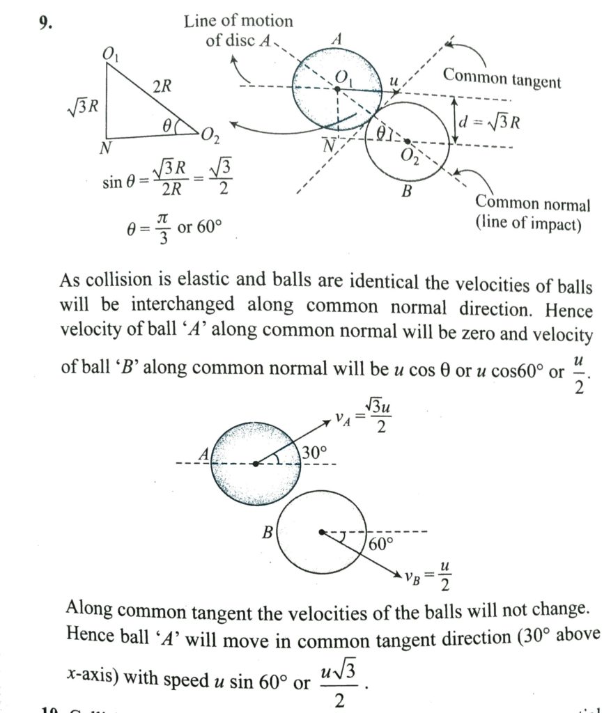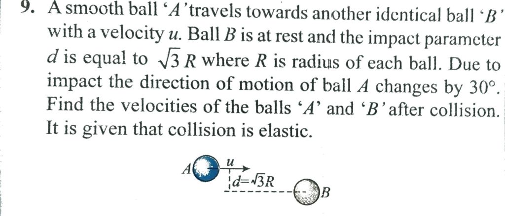 A smooth ball A travels towards another identical ball B with a velocity u. Ball B is at rest and the impact parameter d is equal to 3–√R where R is radius of each ball. Due to impact the direction of motion of ball A changes by 30∘. Find the velocity of B after the impact. It is given that collision is elastic