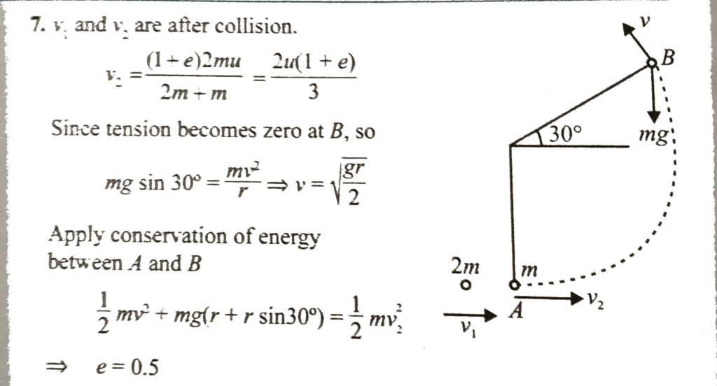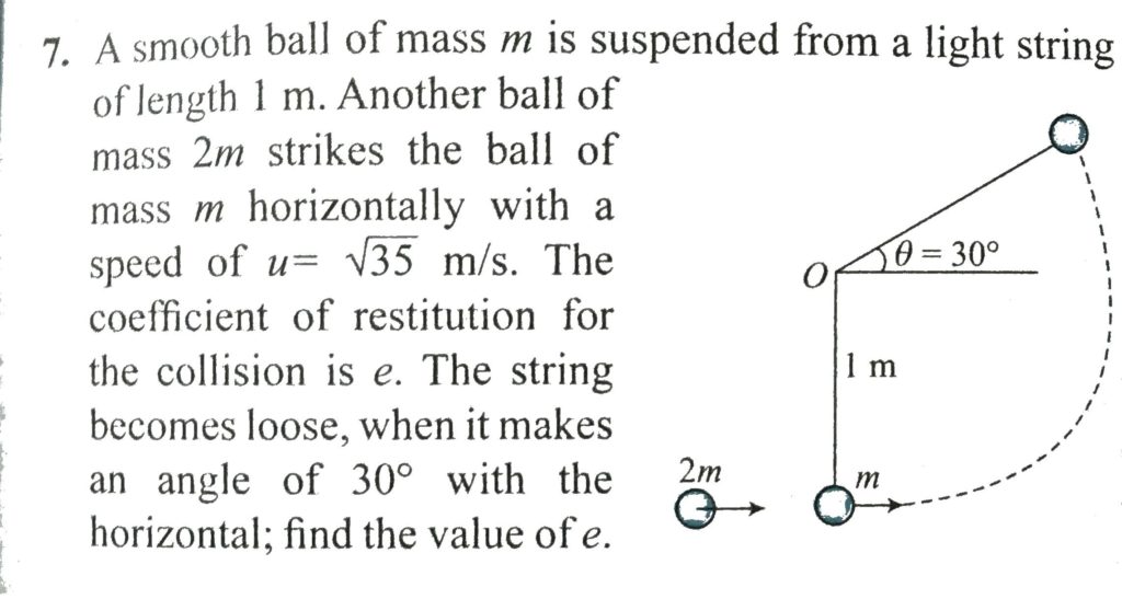 A smooth ball of mass m is suspended from a light string of length 1 m. Another ball of mass 2 m strikes the ball of mass in horizontally with a speed of u = root 35 m/s. The coefficient of restitution for the collision is e. The string becomes loose, when it makes an angle of 30∘ with the horizontal, find the value of e.