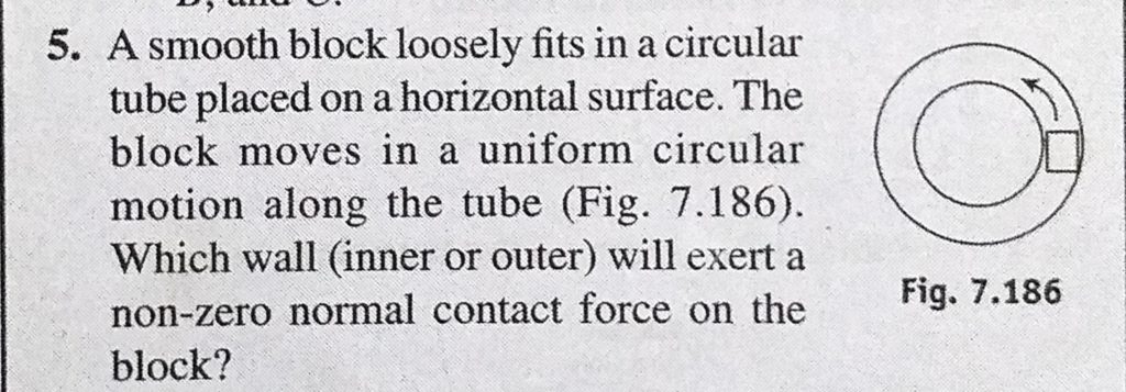 A smooth block loosely fits in a circular tube placed on a horizontal surface. The block moves in a uniform circular motion along the tube (Fig. 7.186 ). Which wall ( inner or outer ) will exert A smooth block loosely fits in a circular tube placed on a horizontal surface. The block moves in a uniform circular motion along the tube (Fig. 7.186 ). Which wall ( inner or outer ) will exert September 30, 2020 Category: Uncategorised (JEE Advanced Physics by BM Sharma + GMP Solutions) , Facebook Messenger WhatsApp Share this:TwitterFacebook Related
