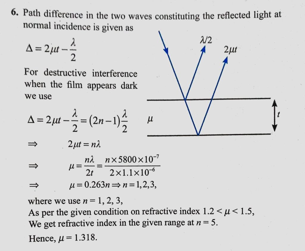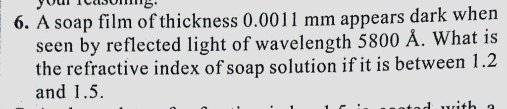 A soap film of thickness 0.0011 mm appears dark when seen by reflected light of wavelength 5800 A. What is the refractive index of soap solution if it is between 1.2 and 1.5 A soap film of thickness 0.0011 mm appears dark when seen by reflected light of wavelength 5800 A. What is the refractive index of soap solution if it is between 1.2 and 1.5 October 9, 2020 Category: Uncategorised (JEE Advanced Physics by BM Sharma + GMP Solutions) , Facebook Messenger WhatsApp Share this:TwitterFacebook Related